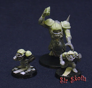 Sobre la peana de plástico decir que es ligeramente más planita que la que vende GW del mismo diámetro. En las siguiente fotos se puede ver como es (es la que está debajo del troll) y una comparación con las peanas de 25mm antes y después del pintado.